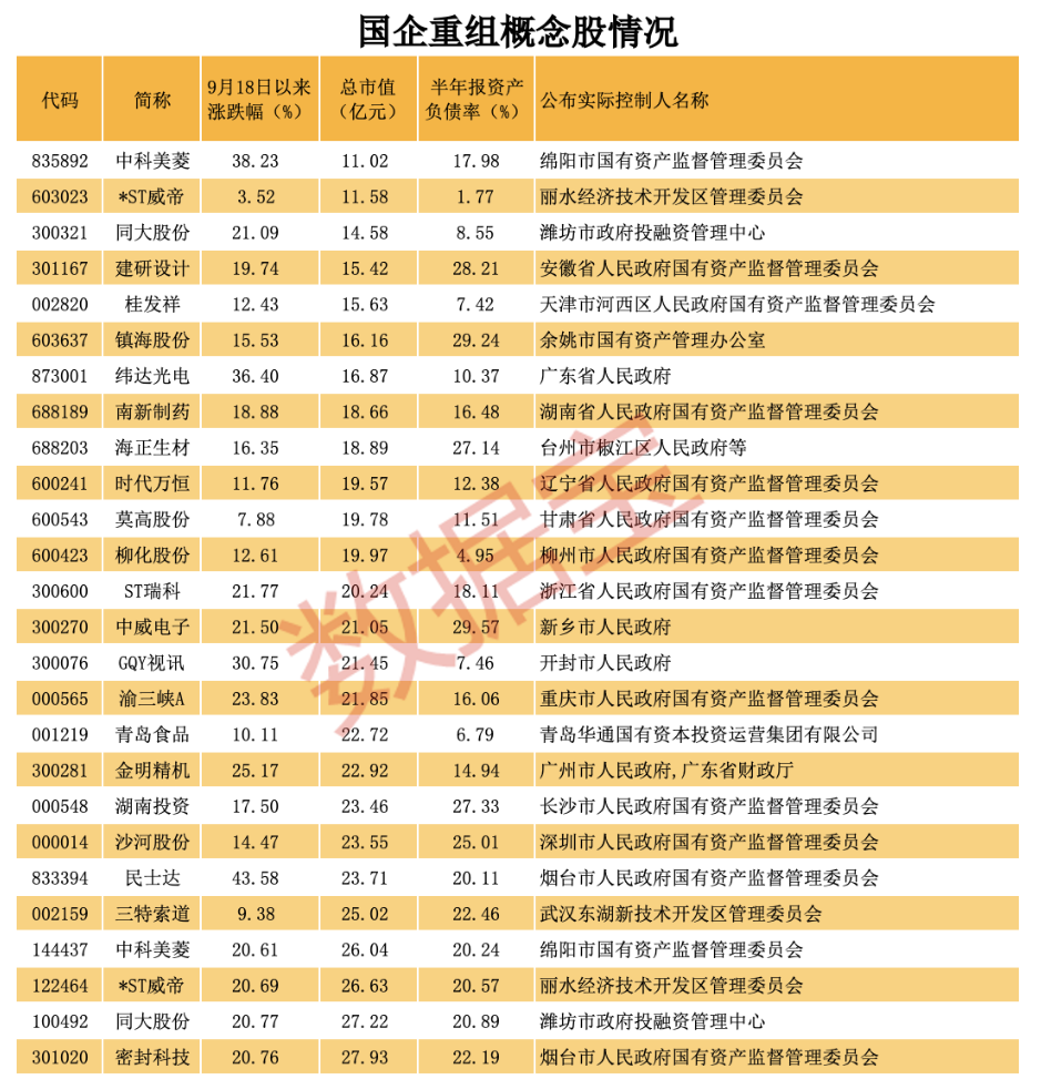 数据宝梳理出国企重组概念,尤其是相对比较优质的国企“壳资源”,这类个股一方面资产较为干净,没有大规模负债;另一方面业绩不算优质,或在市值管理压力之下成为重组对象。