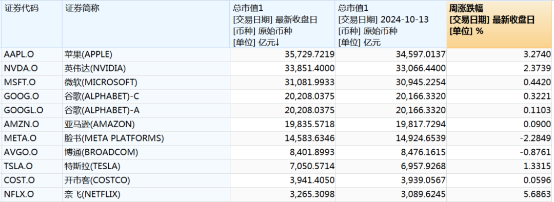 上周,美股大型科技股多数上涨,苹果、英伟达、微软、谷歌-a、亚马逊、特斯拉、奈飞分别累计上涨3.27%、2.37%、0.44%、0.11%、0.09%、1.33%、5.69%,meta累计下跌2.28%。苹果、英伟达、微软、谷歌-a、亚马逊、特斯拉、奈飞七大巨头单周市值合计增长2382亿美元(合人民币16918亿元)。