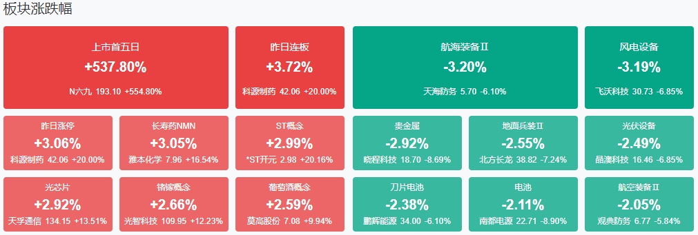 总体上个股跌多涨少,沪深两市半日成交额1万亿,较上个交易日缩量1291亿。板块方面,nmn概念、st板块、半导体、通信设备等板块涨幅居前,风电、军工、白酒、光伏等板块跌幅居前。截至收盘,沪指跌0.5%,深成指跌0.82%,创业板指跌0.57%。
