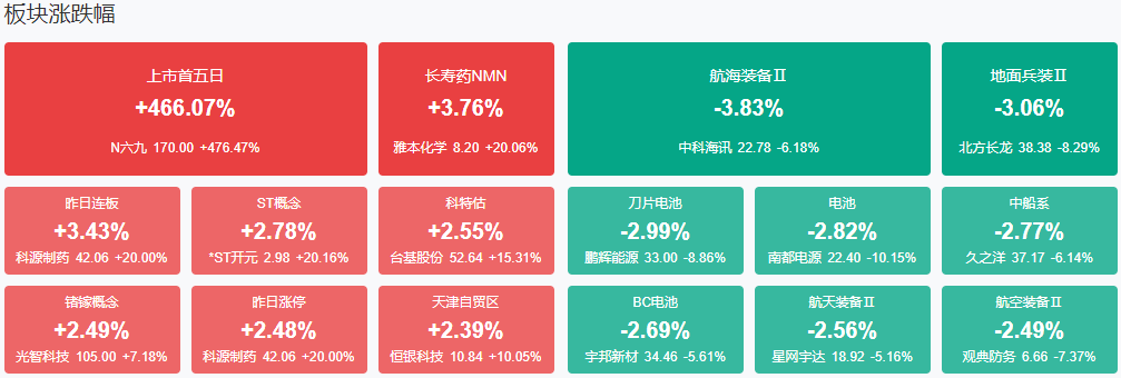 板块方面,nmn概念、st板块、通信设备、半导体等板块涨幅居前,风电、光伏、军工、白酒等板块跌幅居前。