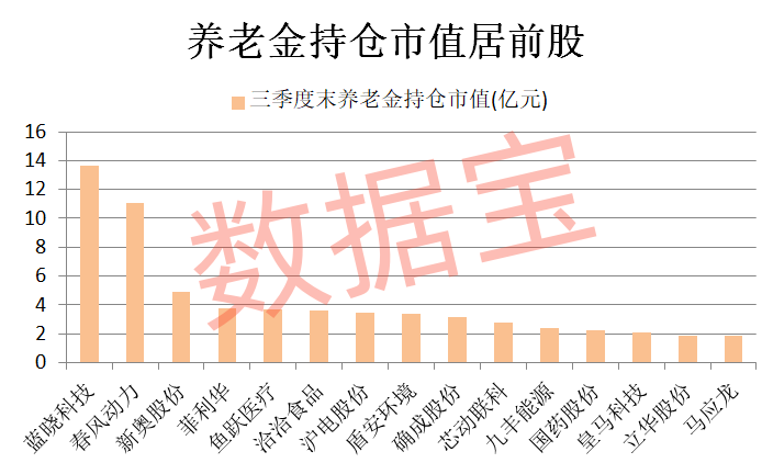 养老金持仓市值最高的是蓝晓科技,共有2只养老金组合重仓,三季度末合计持仓市值达13.66亿元。公司还获得1只社保基金组合重仓,持仓市值达到2.81亿元。