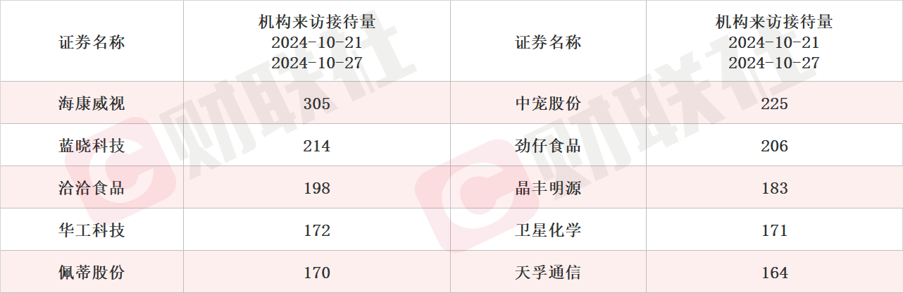 具体上市公司方面,据choice数据统计,富特科技接受调研次数最多,达到3次。从机构来访接待量统计,海康威视、中宠股份和蓝晓科技排名前三,机构来访接待量分别达305家、225家和214家。