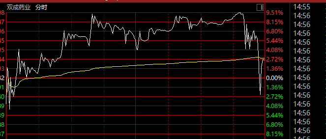 今日多只高位人气股尾盘跳水,此前27个交易日24涨停的双成药业再次逼近涨停价,但在距收盘不到半小时,突然直线跳水,盘中一度翻绿,至收盘以涨2.54%报收,成交51.7亿元,换手率高达32.69%。
