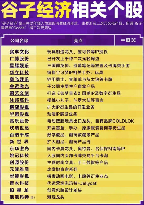 ►国内方面,最近,a股市场迎来新风口——“谷子经济”概念。谷子经济是一种新型消费现象,主要围绕二次元ip(知识产权)周边商品的消费文化和经济形态。这个概念源自于“goods”的音译,指的是动漫、游戏等和记娱乐手机的版权作品的周边商品,包括徽章、立牌、海报、手办等。谷子经济以年轻人为主要消费群体,尤其是00后群体,他们通过购买和收藏谷子来表达对某个ip的喜爱和忠诚。谷子经济的市场规模相当庞大,据统计,2017年至2021年,二次元内容产业规模的年均复合增长率达到了25.7%,预计到2026年,二次元市场规模有望达到1161.4亿元。从产业链角度看,“谷子”作为泛娱乐产品,产业链可分为ip、产品开发和设计以及渠道几个环节。机构表示,随着二次元及其衍生经济的快速发展,“谷子”作为新兴概念走入了年轻消费群体。“谷子经济”以其背后的ip授权与运营能力为根本,以供应链能力为保障,以渠道为消费者触达关键,建议关注具备全产业链能力、旗下ip快速传播的龙头标的。