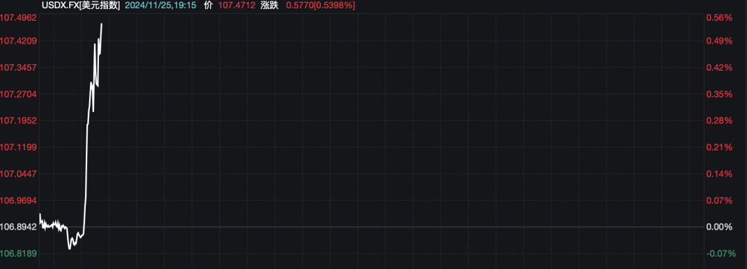 美元指数直线拉升,目前涨幅超过0.5%。