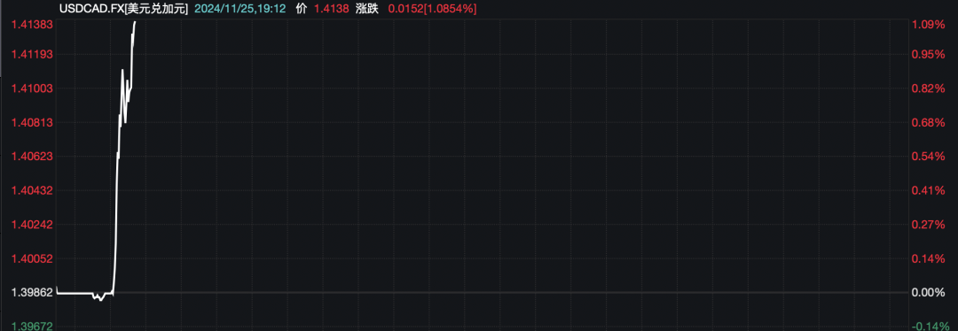 加元兑美元短线走低,跌幅超过1%。