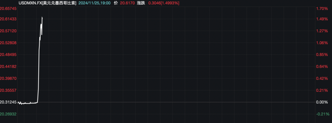 墨西哥比索兑美元跌幅扩大至1.5%。