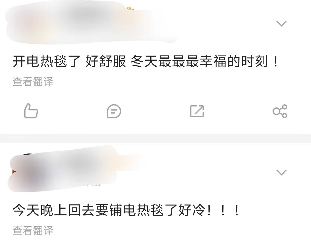 对于天气的降温,不少南方的网友在社交媒体上发言称,“电热毯伟大的发明”“电热毯给了我好多幸福”。