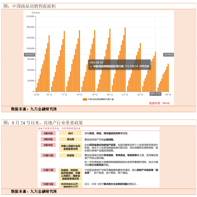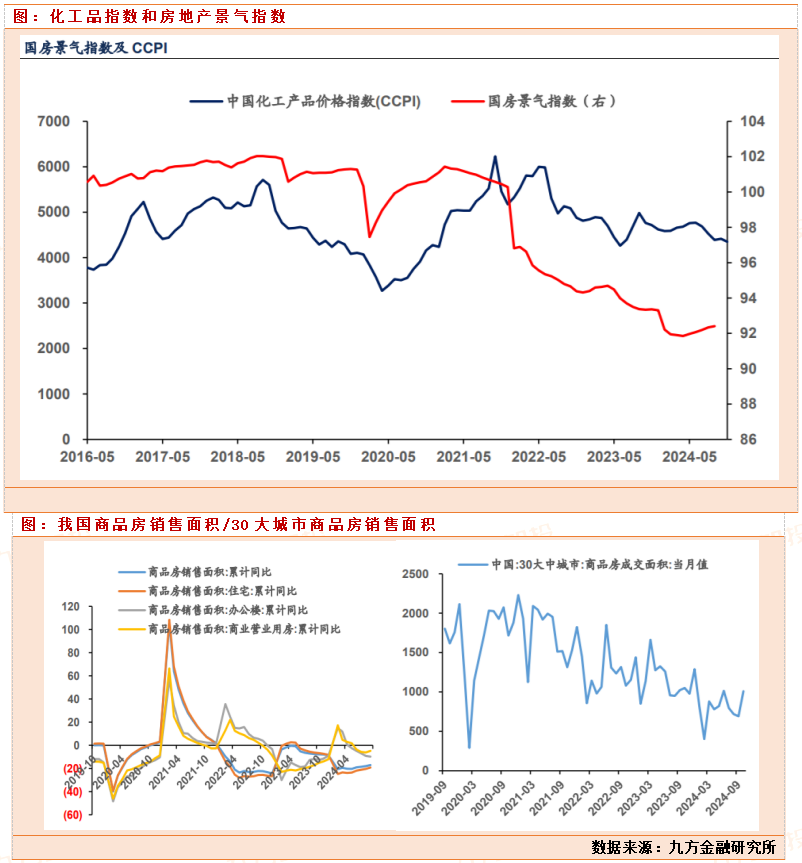 房地产行业作为化工重要的终端下游,承载着较大的消费体量。房地产行业景气度的变化,对地产行业相关化工品景气度影响巨大。一般化工品价格周期滞后竣工周期约一年。随着今年9月底以来,国家不断的房地产政策刺激,我们判断房地产销售数据会逐步好转,从而带动上游地产化工行业景气度开始景气回升。