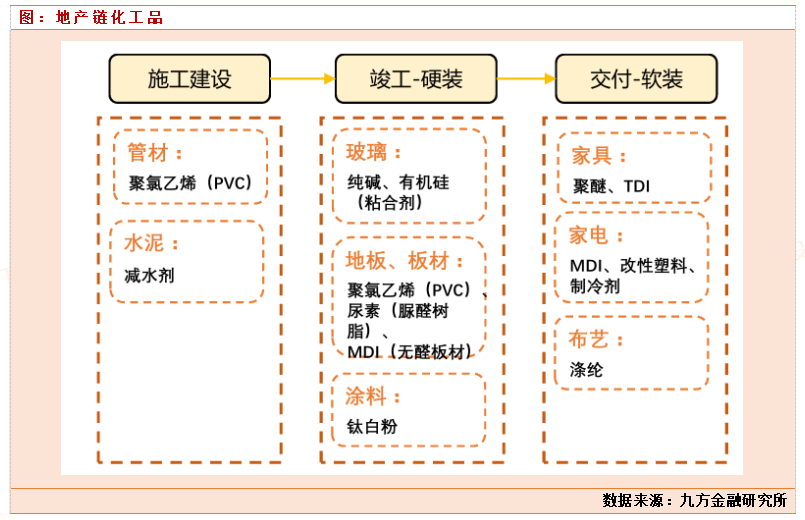 而在地产产业链中,pvc、减水剂、纯碱、有机硅、尿素、mdi、涂料、聚醚、tdi、改性 塑料、制冷剂、涤纶长丝等化工品,都是地产链从施工-竣工-交付三个环节中的相关化工品。地产链直接相关的化工产业,按照由地产商拿地到消费者使用顺序来看,施工建设、竣工(硬装)、交付(软装)三个环节,分别涉及化工材料包括: 施工-建设:pvc管材、水泥减水剂等;竣工-硬装:玻璃相关的纯碱、有机硅粘合剂、pvc 地板、脲醛板材(尿素)、无醛板材(mdi)、钛白粉涂料等;交付-软装:聚醚(硬泡、软 泡)、tdi等家具材料,mdi、改性塑料、制冷剂等家电材料、涤纶等窗帘被单材料等。