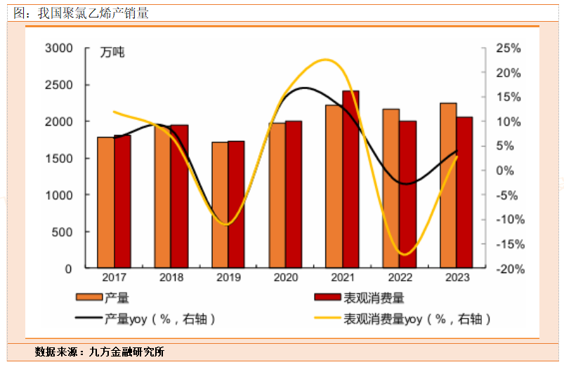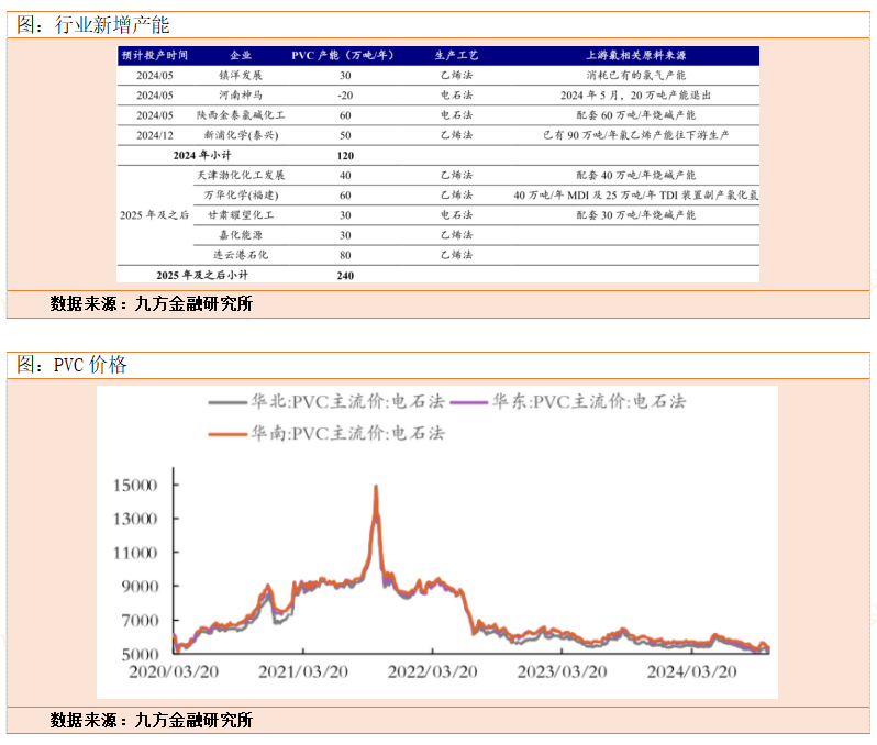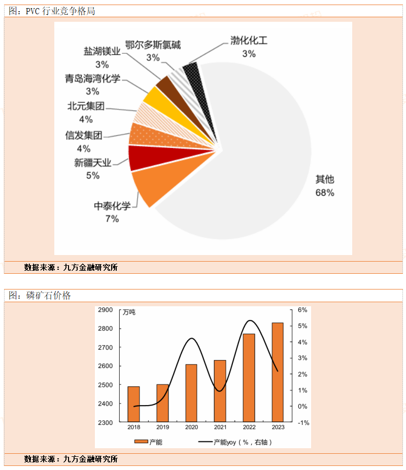 聚氯乙烯(简称 pvc),是我国重要的有机合成材料。从产品分类看,pvc 属于三大合成材料(合成树脂、合成纤维、合成橡胶)中的合成树脂类,其产品具有良好的物理性能和化学性能,广泛应用于工业、建筑、农业、日用生活、包装、电力、公用事业等领域,其中26%的pvc拥有管材。 近年来,我国聚氯乙烯新增装置产能较多,整体处于一个产能过剩状态。据百川盈孚统计,2023 年增长2831万吨,预期2024/2025年行业新增产能在120万吨、240万吨。据百川盈孚统计,2023年我国pvc表观消费量为2062万吨,同比增长2.8%。从消费结构上看,管材、型材及门窗为主要消费领域。pvc行业格局较为分散(龙头中泰化学产能220万吨左右,7%市场占有率),行业厂家较多,叠加行业目前新增产能较多,需求景气度不高,造成目前价格处在历史低位水平,电石法pvc价格在5200元/吨左右,目前价格基本全行业亏损阶段。聚氯乙烯消费集中在房地产等相关领域,近期在国家房地产端相关积极政策推动下,叠加目前极其低迷的价格,行业内原本扩产产能有望停止扩产,行业景气度有望修复。