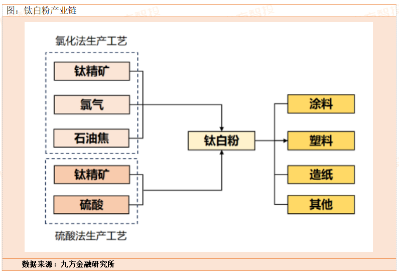 钛白粉(化学式:tio2 ),是一种白色无机颜料,具有无毒、最佳的不透明性、最佳白度和 光亮度,广泛应用于涂料(占比60%)、塑料、造纸、印刷油墨等工业。钛白粉主流生产工艺有两种:硫酸法和氯化法,当前国内主要以硫酸法为主,国外以氯化法为主。