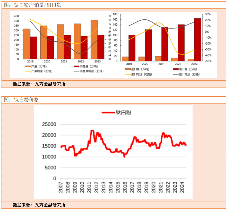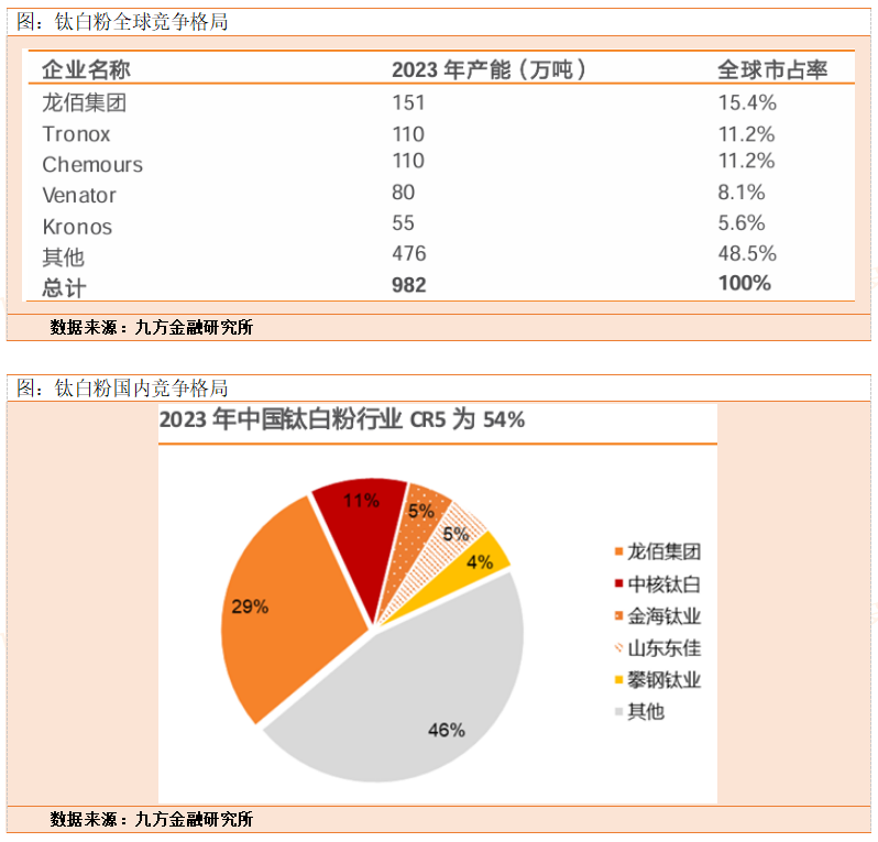 中国是全球钛白粉最大的生产基地,也是最大的出口国。2023年全球钛白粉产能在981.9 万吨,产能增长主要为中国,目前中国产能占全球产能55%;受国际市场需求及钛白市场 行业运行情况影响,科慕、泛能拓部分产能退出,中国钛白产能份额继续逐步扩大。2023 年全球前五大钛白粉企业为龙佰集团/特诺/科慕/泛能拓/康诺斯,全球cr5为51.5%。钛白粉行业格局很好,属于寡头垄断格局。龙佰集团一家独大,市场份额高达46%(国内),这也造就了钛白粉价格景气度要远好于其他地产化工品。2023 年我国钛白粉产量407万吨,同比增长9.9%;消费量为251.3万吨,同比增长3.8%。我国约30%-40%的钛白粉生产用于出口,2023年我国钛白粉出口164.2万吨,同比 17%。钛白粉下游需求以涂料为主,2023年占比达到58%,塑料与造纸占比分别为24%/10%。