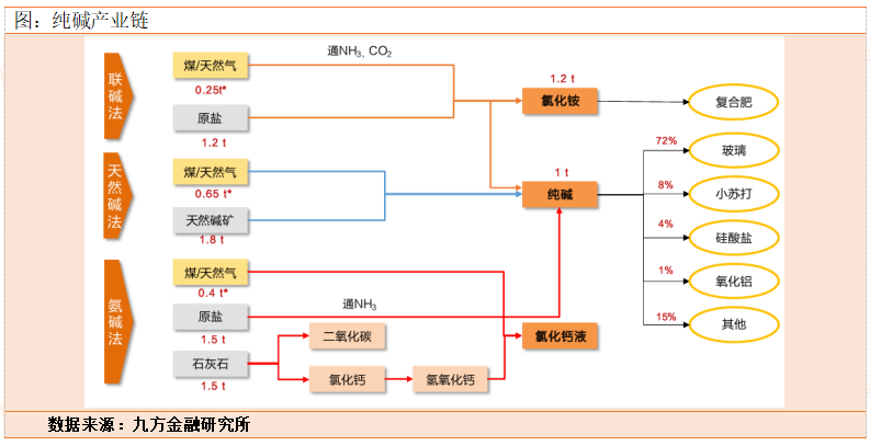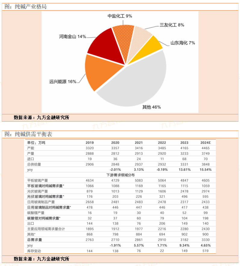 纯碱为“三酸两碱”中的两碱之一,有“化工之母”的美称,广泛应用于建材、化工、冶 金、纺织、食品、国防、医药等国民经济诸多领域,在国民经济中占有重要的地位。我国纯碱主要下游应用 领域为玻璃,包括平板玻璃、光伏玻璃、日用玻璃,消费占比分别为43%、17%、13%;其次为小苏打(7%)、硅酸盐(5%)。2019年至今,国内光伏产业的快速发展,光伏玻璃占纯碱下游应用比例明显提升,2023年已超过日用玻璃成为纯碱下游第二大应用。房地产政策回暖有望进一步托底浮法玻璃对纯碱需求,而光伏玻璃则有望继续提供需求增量。纯碱的行业格局也较为分散,龙头远兴能源,山东海化,三友化工等。因为纯碱价格较低,存在明显的运输半径性。