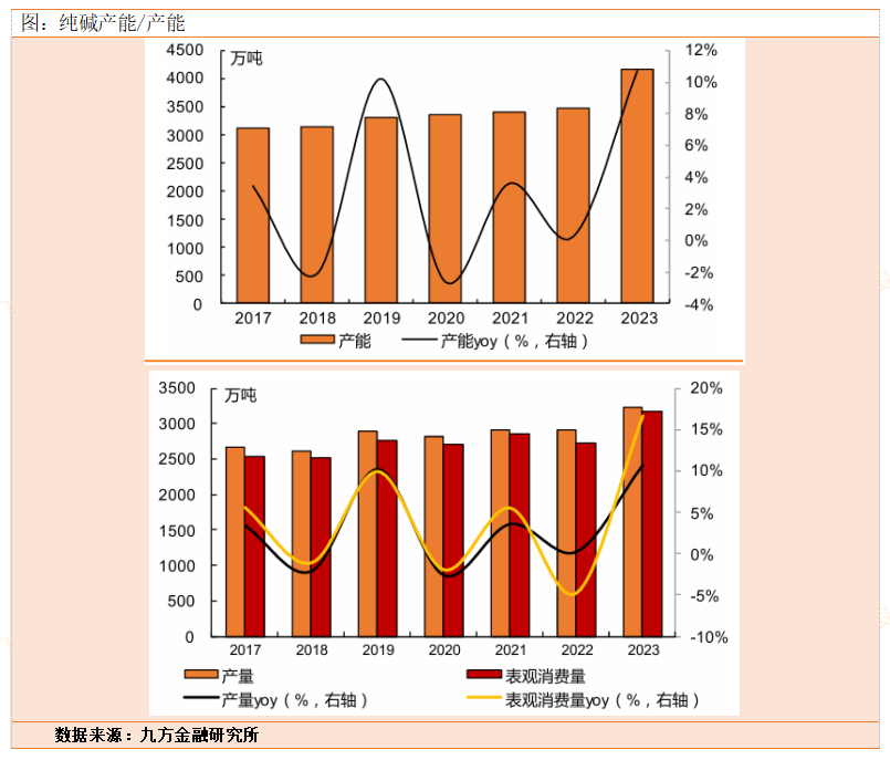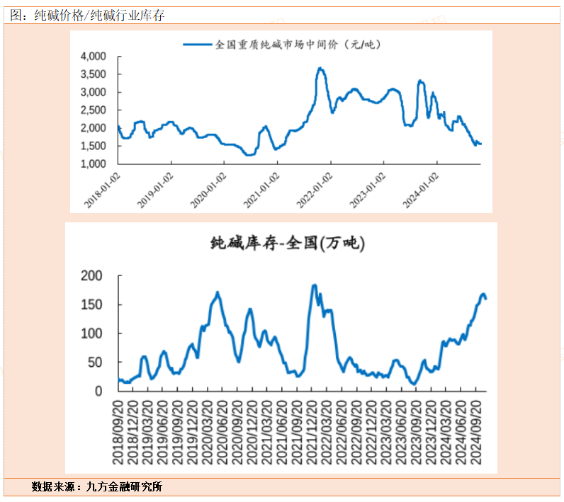 2023年,伴随我国新增纯碱产能释放,行业总产能达4165万吨, 2023年我国纯碱表观消费量为3182万吨,73%应用在玻璃领域。整体行业产能是过剩的,所以纯碱的价格主要受到行业开工率,行业库存影响。当下游玻璃需求好转,行业纯碱库存开始降小,开工率提升,纯碱价格则将上行。目前行业库存在156万吨的较高位置,所以目前价格也处于底部。而据我们统计,25年及以后国内新增产能较少,且预计以天然碱法为主。随着房地产数据好转,纯碱库存将会逐步降低,纯碱价格也将开始上涨,景气度上行,行业公司也将受益。