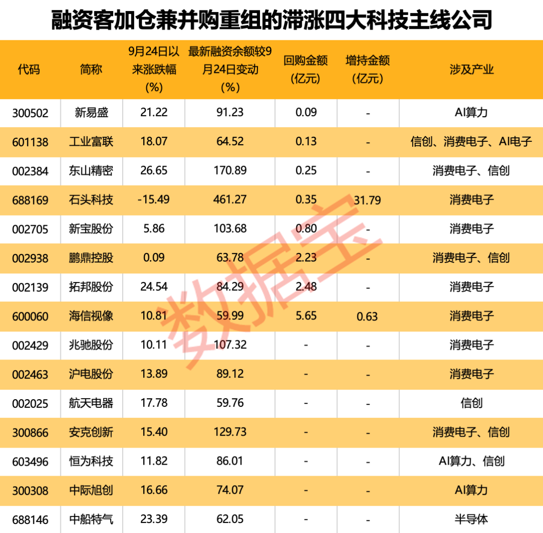 进一步来看,上述383家公司中,9月24日以来跑输wind科技指数(27.62%),且最新融资余额较9月24日加仓超过50%的公司仅有35家。按照首次公告日计算,今年以来参与并购重组(含定增,剔除失败案例)的公司仅有15家,涉及交叉概念的公司有鹏鼎控股、工业富联、东山精密等。