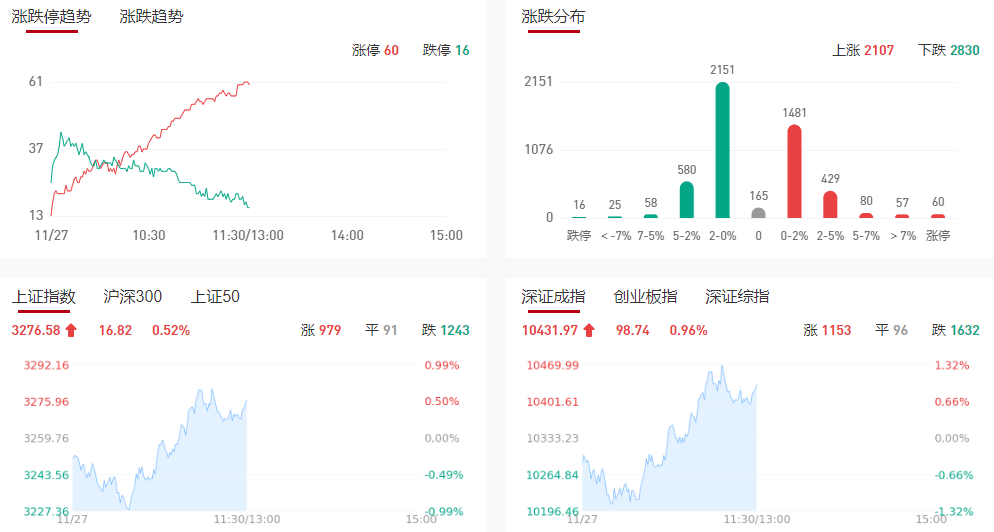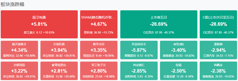 市场早盘探底回升,创业板指领涨。沪深两市半日成交额8910亿,较上个交易日放量493亿。盘面上,ip经济概念股持续活跃,恒信东方、华立科技、广博股份、洪兴股份涨停。家电股盘中走强,浙江美大、日出东方涨停。燃气股再度拉升,南京公用、东方环宇涨停。卫星导航概念股盘中异动,华如科技、铖昌科技、星网宇达涨停。下跌方面,农业股陷入调整,辉隆股份等跌超5%。