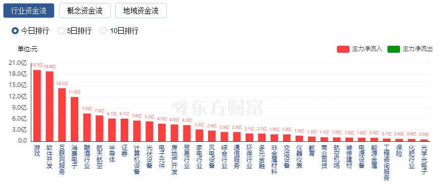 行业资金流向:19.21亿净流入游戏