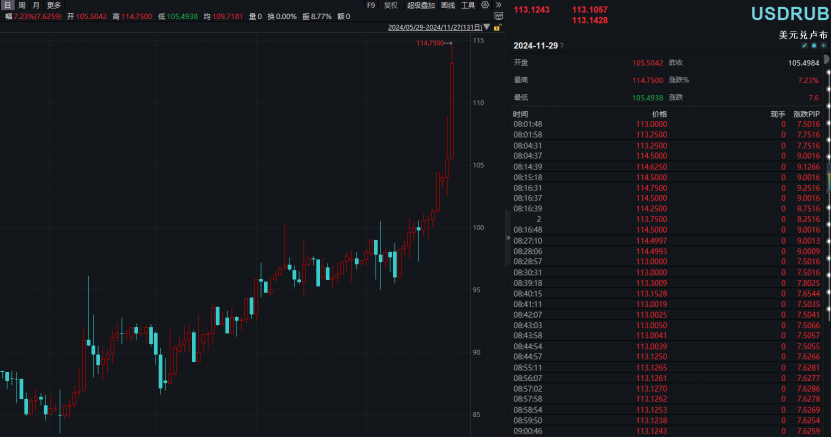当地时间11月27日,俄罗斯卢布出现恐慌性抛售,卢布兑美元汇率盘中一度跌超8.5%,达到1美元兑114.75卢布,创出一年来新低;俄罗斯卢布兑欧元汇率也已跌破1欧元兑换120卢布,盘中跌幅一度超过9%。