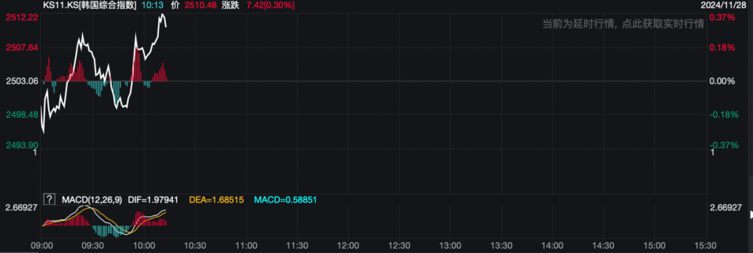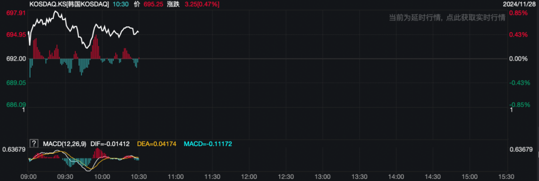 韩国股市震荡走高,韩国综合指数盘中出现直线拉升,但总体震荡幅度不大;韩国kosdaq指数窄幅震荡。
