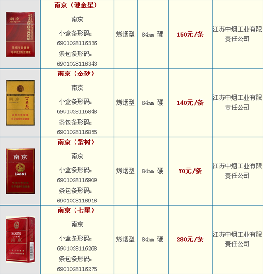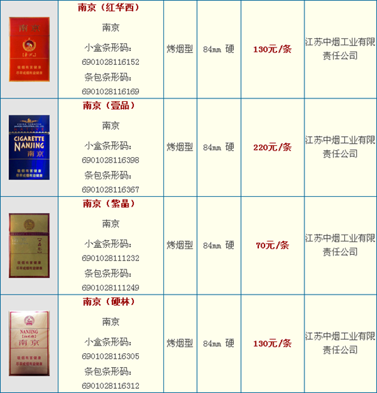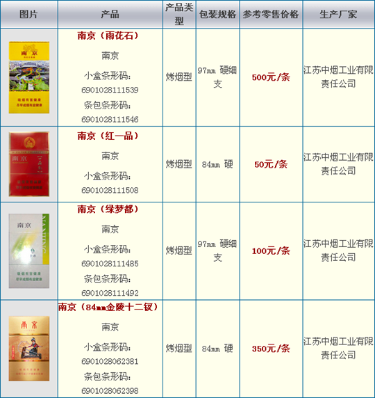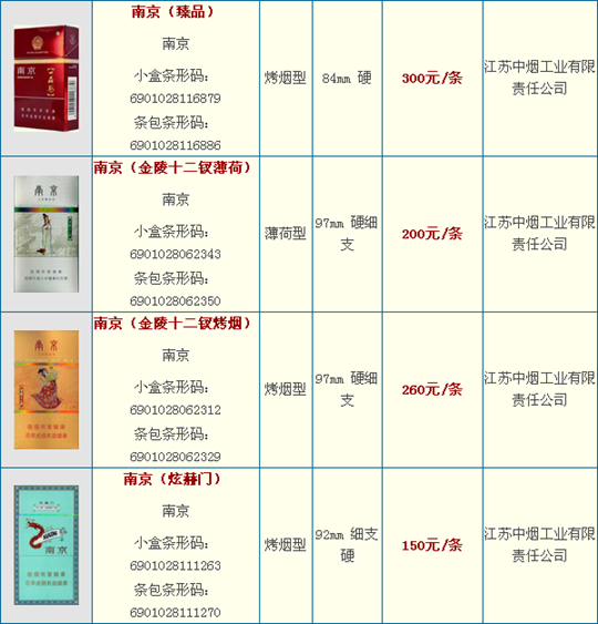 南京卷烟是江苏中烟南京卷烟厂的代表品牌,目前南京拥有南京九五、南京五星、南京特醇、南京红、南京喜庆、南京佳品、南京绿、南京精品、南京珍品等品种和系列。南京香烟最早诞生于中华民国时期的南京光明兄弟烟厂,1956年公私合营勤丰烟厂生产南京第二代,1968年国营南京卷烟厂推出南京第三代,1982年又改进推出了南京第四代,90年代南京卷烟厂推出第五代南京,受到市场广泛认可。南京品牌不断完善和成长,2008年成为全国性卷烟重点骨干品牌之一。
