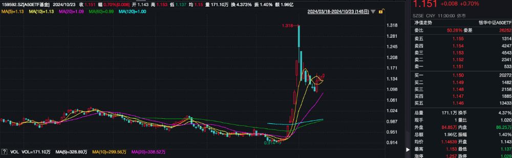 相关etf方面,a50etf基金(159592)低开高走,截至午间收盘涨0.70%,有望四连阳,成交额1.96亿元,换手率超4.3%,早盘交投活跃。数据显示,截至10月22日,该etf最新流通规模44.72亿元,最新流通份额39.12亿份。