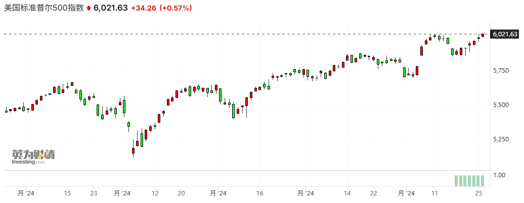 截至收盘,道琼斯指数涨0.28%,报44,860.31点,连涨五天;标普500指数涨0.57%,报6,021.63点,连涨第七天;纳斯达克综合指数涨0.63%,报19,174.30点,连涨四天。