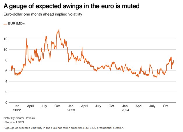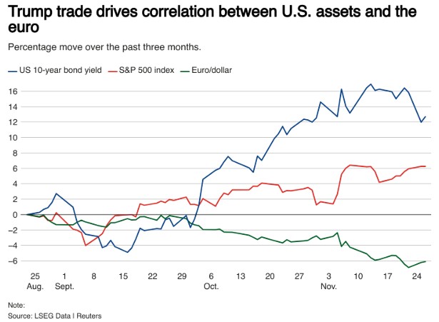 市场对欧元兑美元汇率的敏感性也有所上升,此前外汇策略师表示,交易员争相买入期权合约,这些合约结合了对特朗普政策的跨资产结果的押注,如欧元走软和标普指数上涨。