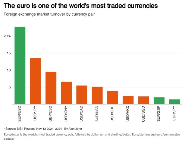 11月,欧元兑美元汇率下跌了约3.8%。在美国候任总统特朗普提议的贸易关税、欧元区经济疲软和俄乌冲突不断升级的压力下,欧元对美元汇率现在正徘徊在关键的1关口,与此同时,美国的经济增长押注提振了美国股市和美元。