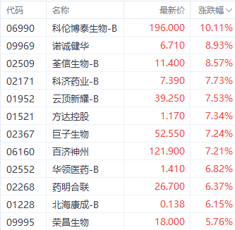 医药股中,科伦博泰生物-b(06990.hk)、科济药业-b(02171.hk)、百济神州(06160.hk)分别上涨10.11%、7.73%、7.21%。