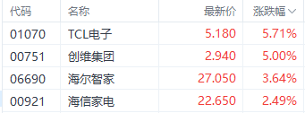 家电股中,tcl电子(01070.hk)、创维集团(00751.hk)、海尔智家(06690.hk)分别上涨5.71%、5%、3.64%。