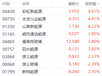 光伏股中,彩虹新能源(00438.hk)、山高新能源(01250.hk)、阳光能源(00757.hk)分别上涨4.81%、4.22%、3.42%。