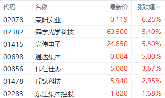 消费电子股中,舜宇光学科技(02382.hk)、高伟电子(01415.hk)、丘钛科技(01478.hk)分别上涨5.40%、5.30%、2.95%。